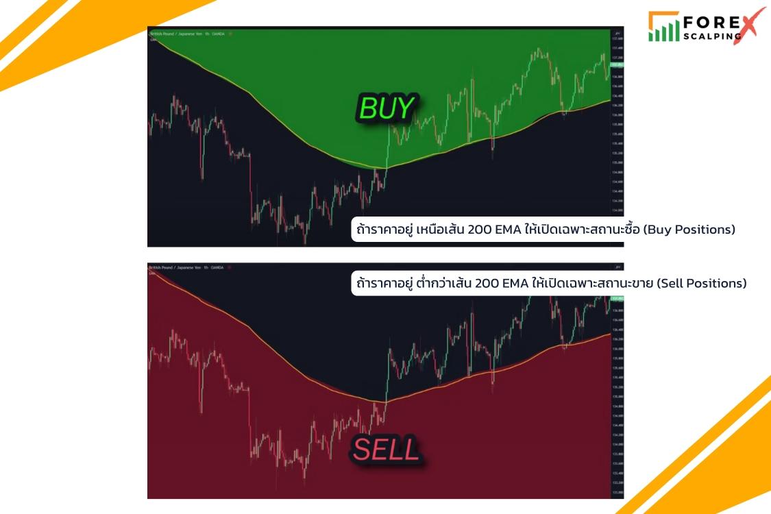 - ถ้าราคาอยู่ เหนือเส้น 200 EMA ให้เปิดเฉพาะสถานะซื้อ (Buy Positions)